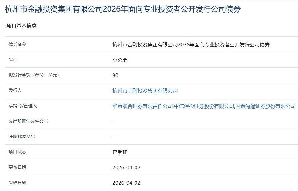 【大河财立方消息】4月3日消息,杭州市金融投资集团有限公司2026年面向专业投资者公开发行公司债券项目获上交所受理。本期债券拟发行金额80亿元,承销商/管理人为华泰联合证券、中信建投证券、国泰海通证券。